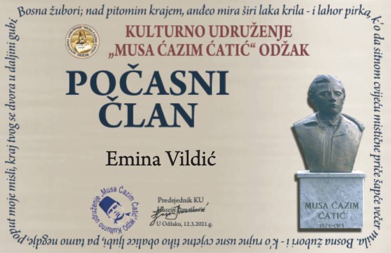 Yeni Türk Edebiyatı Anabilim Dalında Doktora çalışmalarını sürdüren öğrencimiz Emina Vildić; çağdaş Bosna edebiyatının en önemli temsilcilerinden Musa Ćazim Ćatić’in anısını yaşatmak için yaptığı çalışmalarla, Bosna Hersek’in Ocak şehrinde bulunan Musa Ćazim Ćatić Kültür Derneği tarafından “Fahri ve Onursal Üye” ilan edildi.