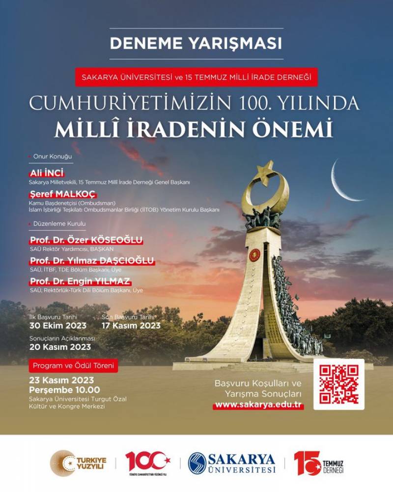 Son başvuru tarihi 17 Kasım 2023 olan Cumhuriyetimizin 100. Yılında Millî İradenin Önemi Deneme Yarışması katılımcılarını bekliyor.