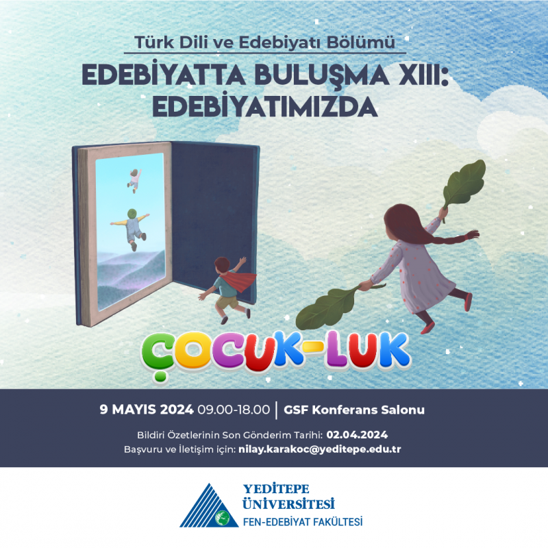 Yeditepe Üniversitesi Türk Dili ve Edebiyatı Bölümü'nün her yıl “Edebiyatta Buluşma” adıyla gerçekleştirdiği öğrenci sempozyumu, bu yıl 9 Mayıs 2024 tarihinde, “Edebiyatta Buluşma XIII – “Edebiyatımızda Çocuk-luk” başlığıyla düzenlenecektir. Katılım sağlamak isteyen öğrencilerimiz için afiş ve başvuru formu ektedir.