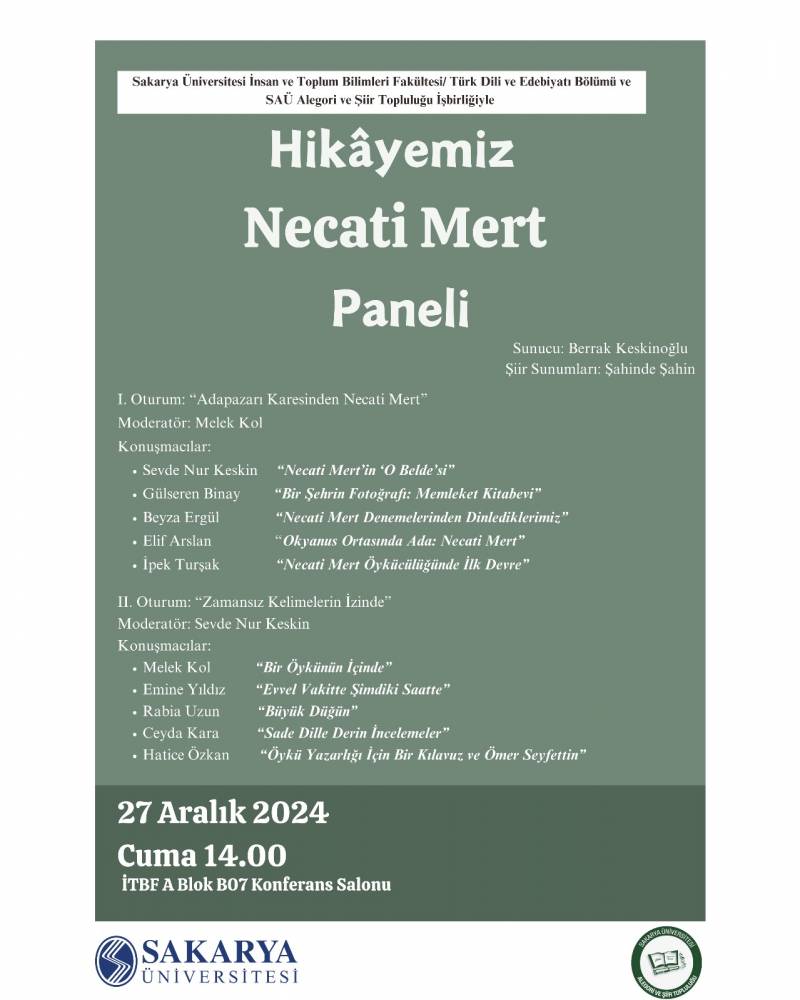 Sakarya Üniversitesi Türk Dili ve Edebiyatı Bölümü ile Alegori ve Şiir Topluluğu'nun birlikte düzenlediği "Hikâyemiz Necati Mert" paneli Türk Dili ve Edebiyatı lisans ve yüksek lisans öğrencilerinin sunumlarıyla gerçekleşti.